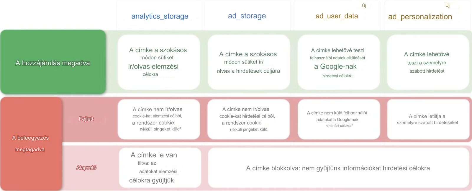 - Alapvető (Basic) hozzájárulás: Ez a legegyszerűbb megvalósítási mód, és csak azt jelzi a Google-nek, hogy a felhasználó hozzájárult-e a személyre szabott hirdetésekhez vagy sem. A nyomkövetés és adatgyűjtés csak akkor aktiválódik, ha a felhasználó beleegyezett a cookie-k használatába.